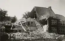 When the 41 bombers flew over IJmuiden, it became clear that the weather conditions were unfavourable.[2][13] The bombardier in the lead aircraft could not identify the intended target in time due to cloud coverage, so the formation was ordered to break off the attack. However, confusion arose among the still inexperienced crew. An aircraft flying behind the lead aircraft saw the target and decided to continue to drop its bombs, followed by other aircraft behind him.[13][17][18] The aiming and dropping failed, and the bombing was disastrous. The in-air observation of the USAAF-crew was clear: “no bursts were seen in the immediate vicinity of the Fokker complex.” In reality not a single bomb hit the intended Fokker Factory, over 200 high-explosive bombs landed 600 to 1200 meters from their target on the surrounding residential areas, a monastery, churches, and furniture and tar factories. The attack resulted in a total of 185 casualties.[14][17][19][20] Hundreds were injured, of which many later died from these injuries. 130 houses were destroyed,[21] 206 houses were severely damaged,[14] and 676 houses suffered glass and roof damage.[1][2][4][7][10][11]