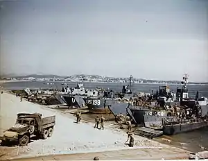 To minimize congestion at Naples, the French forces in Italy, the 1st Motorized Infantry Division and the 3rd Algerian Infantry Division, embarked from Brindisi and Taranto. The 1st Special Service Force and the Commandos d'Afrique embarked at Agropoli. Oran was the secondary mounting port where most of the follow-on French forces were embarked, the exception being the 9th Colonial Infantry Division, which was on Corsica, and was loaded at Ajaccio. Air Force units coming from Corsica were loaded at Calvi and L'Île-Rousse.[48] All ships were loaded and ready to sail on 8 August.[46][47] Hewitt's Western Naval Task Force consisted of 885 ships and landing craft that sailed under their own power with 1,375 smaller landing craft carried on board them.[49]