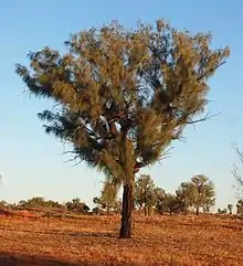 Desert oak mainly grows in the swales between sand dunes in red sand. It is mainly found in the arid lands of the south of the Northern Territory, but is also common in inland Western Australia east of Billiluna to the Mann and Musgrave Ranges in the far north-west of South Australia.[6] It is the only member of its family to occur in these areas, apart from Casuarina glauca that has been introduced in some of these areas.[2][3][5][6]