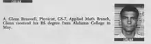 After graduation, Braswell went to work in 1965 for the U.S. Navy Mine Defense in Panama City, Florida Laboratory (now called Naval Surface Warfare Systems – Panama City). See the picture from The Underseer of July 16, 1965, for his hire-in ID. On January 23, 1967, he left the Navy job to hire in to Lockheed-Georgia Company in Marietta, Georgia, as a programmer.