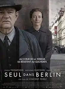 Alone in Berlin is a 2016 war drama film which was directed by Vincent Pérez and written by Pérez and Achim von Borries. It is based on the 1947 fictionalised true story Every Man Dies Alone, by Hans Fallada. The novel's characters Otto and Anna Quangel are based on Otto and Elise Hampel. When their son dies in France, the couple start writing postcards to urge people to protest against Adolf Hitler and the Nazi regime. The film stars Emma Thompson, Brendan Gleeson, Daniel Brühl, and Mikael Persbrandt. Principal photography began on 27 March 2015 in Berlin. It was selected to compete for the Golden Bear at the 66th Berlin International Film Festival.[2]