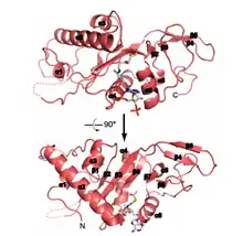 This protein has a length of 421 amino acids, among which, we have to highlight the Glutamine number 58 (Gln or Q), which is crucial for catalytic activity.