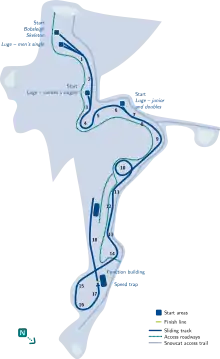 In 1997, the women's single luge start house was created before turn three after being shared with the men's double luge start house before turn seven from 1989 to 1996.[10] Women's skeleton first began competition in 1999 while women's bobsleigh first started the following year.[11][12][13] An 18th curve was modified during the summer of 2007 with the addition of a finish curve and straightaway.[14]