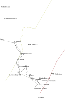 The Altoona and Beech Creek reported itself in the Official Guide of 1903 as having been extended to Fallentimber, 5 miles (8.0 km) beyond Dougherty. However, it does not appear that this extension was, in fact, built.[5] By 1909, the railroad had built two short branches of 1.4 miles (2.3 km) each at the Juniata end of the line. The Kipple Branch left the main line near Broadway and Penn Avenue, Juniata, and circled around to the north, serving a few local industries and reaching the PRR's main line at Juniata Junction, near 2nd Avenue and 10th Street. The Fairview Branch ran southwest from a wye near 25th Avenue and Broadway to end in the Fairview neighborhood of Altoona, at 23rd Avenue and 10th Street.[9]
