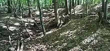 The soil deformations caused by the rampart and ditch of the fort's defenses can still be clearly traced in the terrain today, although the ditch has flattened out considerably due to erosion and the rampart is only preserved up to a height of 1.20 m.