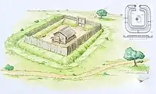 A rampart and a ditch 5 meters wide and 1.5 meters deep served as a first defense line. With its only gate, the camp faced north, towards the Limes frontline.