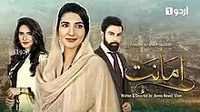 Amanat is a Pakistani social drama series, produced by Amna Nawaz Khan under their production banner ANK Production while she also directed and written this serial. The drama airs weekly on Urdu 1 every Tuesday. It stars Rabab Hashim, Noor Hassan Rizvi and Sehar Afzal in lead roles.[1][2][3]