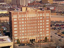 The hotel building currently has 55 guest rooms[4] and is located at the northwest corner of Main Street and 14th Street in Tulsa. It is included as a supporting item in the Riverview Historic District. Although the street address is given as 1324 South Main, the main entrance is actually on 14th Street, which runs along the south of the building. Constructed primarily of poured concrete columns and beams, it measures 120 feet (37 m) by 40 feet (12 m) in plan, It is 9 stories high and has a full basement. The ninth floor has a concrete slab ceiling. The building roof is flat and hidden from street view by a parapet. It was originally built on a wooden frame a few feet above the slab ceiling and was covered with asphalt. The frame was deteriorated beyond repair by 1999 and needed to be replaced. The replacement was to have a light steel frame.[5]