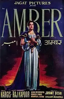 Amber (transl.The Sky), also called Ambar, is a 1952 Hindi costume action romance thriller film directed by Jayant Desai.[1] The story was by Dwarka Khosla and Bachoobhai Shukla, with dialogues by Munshi Sagar Hussain and Arjun Dev Rashk. The screenplay was credited to Uma Devi. The film was produced by Seth Jagat Narain for his banner, Jagat Pictures, with music by Ghulam Mohammed.[2] The actress Tanuja was credited as Baby Tanuja and played the role of a young Nargis.[3] The film starred Raj Kapoor, Nargis, Agha, Bipin Gupta, Vyas, Cuckoo, Helen and Samson.[4]
