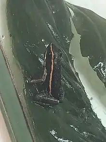 The Amarakaeri poison frog is a medium-sized dart frog with a black unmarked dorsum, and an orange dorsolateral stripe running from the tip of the snout to the groin where it turns into a bright orange blotch that extends slightly to the anterior surface of the thigh. Under the eye the frog has a whitish-bronze labial stripe which extends under the tympanum to the base of the upper arm. The legs are brown with faint dark mottling. All ventral surfaces are a bright blue against a bold black reticulated pattern. The blue pattern fades to a pale grey or bronze color on the lateral sides of the frog before fading away entirely. Their iris is black with copper flecks.[3] The eggs are covered in a transparent orange mucilage.