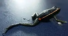 Ameerega shihuemoy, the Amarakaeri poison frog, is a species of dart frog endemic to a small region in southeastern Peru in the Manú District where it lives in the transition zone between montane rainforest and the lowland rainforest. The frog is a member of the Ameerega picta group.[2] It was discovered at the Manú Learning Centre where it is known to occur in pieces of selectively logged forest.[3] This species is threatened by habitat loss due to agriculture, gold mining, oil extraction, road construction, and logging.[1] Currently the frog is only known from nine locations globally; three sites in the Manú Biosphere Reserve, and six in Amarakaeri Communal Reserve.[2] Initially it was considered for a status of vulnerable or near-threatened, but due to its low number of known localities it has been considered endangered.[1]
