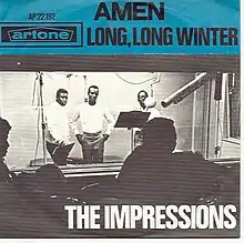 The song went to number one on Cashbox Magazine's R&B chart for three weeks and reached #7 on the Billboard Hot 100 singles chart in 1964.[5] The B-side, "Long, Long Winter", peaked at #35 on the Cashbox R&B chart. A new version was released by The Impressions in 1969 under the title "Amen (1970)", reaching #44 on the Billboard Best Selling Soul Singles chart in January 1970.