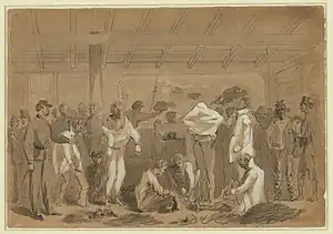 Returned prisoners of war exchanging their rags for new clothing, drawn by William Waud