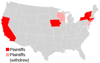 State plaintiffs in the case. New Jersey and Wisconsin, in light red, eventually withdrew. The Supreme Court held that state parties had standing following the precedent of Massachusetts v. Environmental Protection Agency.