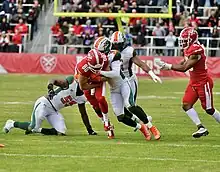 Action from the DC Defenders (red) and Seattle Dragons (white) in the XFL, a professional league that has undergone three incarnations in its history.