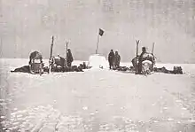 The party made good initial progress, travelling around 15 nautical miles (28 km) each day. The dogs ran so hard that several from the strongest teams were detached from the traces and secured onto the sledges to act as ballast.[114] In their wolf-skin and reindeer-skin clothing the men could cope with the freezing temperatures while they kept moving, but when they stopped they suffered, and barely slept at night. The dogs' paws became frostbitten.[112] On 12 September, with temperatures down to −56 °C (−69 °F), the party halted after only 4 nautical miles (7.4 km) and built igloos for shelter.[114] Amundsen now recognised that they had started the march too early in the season, and decided they should return to Framheim. He would not risk the lives of men and dogs for reasons of stubbornness.[115] Johansen, in his diary, wrote of the foolishness of starting prematurely on such a long and historic journey, and of the dangers of an obsession with beating the English.[116]