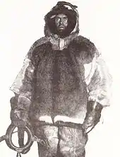 The party's ski boots, specially designed by Amundsen, were the product of two years' testing and modification in search of perfection.[54] The party's polar clothing included suits of sealskin from Northern Greenland, and clothes fashioned after the traditional garments of the Netsilik Inuit from reindeer skins, wolf skin, Burberry cloth and gabardine.[55][56] The sledges were constructed from Norwegian ash with steel-shod runners made from American hickory. Skis, also fashioned from hickory, were extra long to reduce the likelihood of slipping into crevasses.[57] The tents—"the strongest and most practical that have ever been used"[58]—had built-in floors and required a single pole. For cooking on the march, Amundsen chose the Swedish Primus stove rather than the special cooker devised by Nansen, because he felt the latter took up too much space.[59]