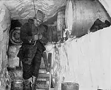 The sun set over Framheim on 21 April, not to reappear for four months.[104] Amundsen was mindful of the boredom and loss of morale that had blighted the Belgica expedition's winter in the ice, and although there was no possibility of sledging he ensured that the shore party kept busy.[105] One urgent task was to improve the sledges, which had not worked well during the depot journeys. In addition to those chosen specifically for the expedition, Amundsen had brought along several sledges from Sverdrup's 1898–1902 Fram expedition, which he now thought would be better suited to the task ahead. Bjaaland reduced the weight of these older sledges by almost a third by planing down the timber, and also constructed three sledges of his own from some spare hickory wood. The adapted sledges were to be used to cross the Barrier, while Bjaaland's new set would be used in the final stages of the journey, across the polar plateau itself.[106] Johansen prepared the sledging rations (42,000 biscuits, 1,320 tins of pemmican and about 220 pounds (100 kg) of chocolate),[107] while other men worked on improving the boots, cooking equipment, goggles, skis and tents.[108] To combat the dangers of scurvy, twice a day the men ate seal meat that had been collected and frozen in quantities before the onset of winter. The cook, Lindstrøm, supplemented the vitamin C intake with bottled cloudberries and blueberries, and provided wholemeal bread made with fresh yeast, rich in B vitamins.[109][110]