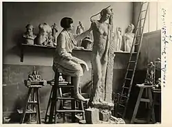 During one of her stays in Portugal, in 1930, she was invited to exhibit at an Exhibition of Ancient and Modern Feminine Work, organized by the Conselho Nacional das Mulheres Portuguesas. In 1932, she started the Salão dos Artistas Criadores (Salon of Creative Artists), together with the painter Maria Adelaide Lima Cruz and the sculptor Maria José Dias da Câmara, with whom she at the time maintained a relationship and shared a studio in Lisbon. In 1939, she faced some controversy, having made public her relationship with the singer and actress Corina Freire. One of her works, Ouvindo o Sermão (Listening to the Sermon), was refused by the jury of the National Society of Fine Arts. Interviewed about the exhibition, she claimed that "modernism does not exist in Portugal. Nobody knows what it is". Nevertheless, she was invited to exhibit at the Portuguese World Exhibition in Lisbon in 1940, where she exhibited a bas-relief based on a literary character of her grandfather.[1][2]