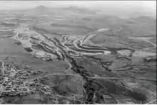 Anaconda was a small mining community in Cibola County, New Mexico. The town came into existence in the early 1950s when the Anaconda Copper Company of Butte, Montana opened up a uranium ore processing plant 10 miles (16 km) northwest of Grants, along Route 66, to process ore from the Jackpile Mine (or Jackpile-Paguate Mine),[1][2] then the world's largest open-pit uranium mine.[3] Anaconda was the site of somewhere around 100 homes for the supervisors and management of the company. The Mill was also located on the same property. Contrary to reports, none of the homes were built using "radioactive" material from the plant. Referred to by the residents as "Camp", a carryover from the original tents used as temporary housing during the initial establishment of the operations. The housing was built in three phases. The first group of about 35 houses was constructed of cinderblock walls and had exposed beam ceilings. A building with four efficiency type apartments was included and used to house unmarried employees and was known as the Bachelors Quarters, or simply "The BQ". The two subsequent groups of approximately the same number were wood frame construction with stucco exteriors. The groups came to be called by the order of their building. Old Camp, Middle Camp and New Camp The Mill closed in early 1980s and the houses were sold and removed and the land reclaimed during the next 20 years. Testimony given before the New Mexico Legislature's Economic and Rural Development Committee in 2008 claimed that the mill had polluted local aquifers.[4] Presently there is little to show that the area was once a community.