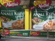 Analı kızlı soup is a soup from Turkey (Adana, Tarsus, Gaziantep, Kahramanmaraş, Malatya) which includes meatballs, tomato, bulgur, and chickpeas. 'Analı kızlı' means, literally, 'with daughters and mothers', daughters being the chickpeas, and mothers the bulgur balls (i.e., meatballs covered with a thin layer of bulgur), all in a soup like a yogurt sauce. It is a part of traditional Turkish cuisine.[1]