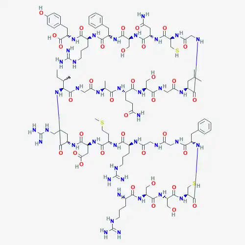 • InChI=1S/C112H177N39O35S3/c1-7-56(4)88(151-98(175)65(25-17-36-127-112(122)123)139-101(178)72(43-87(164)165)144-97(174)67(32-37-189-6)140-94(171)63(23-15-34-125-110(118)119)134-84(161)45-128-82(159)44-129-92(169)69(39-58-18-10-8-11-19-58)141-106(183)79(54-188)150-104(181)77(52-155)149-103(180)75(50-153)146-90(167)62(113)22-14-33-124-109(116)117)107(184)132-46-83(160)133-57(5)89(166)137-66(30-31-80(114)157)96(173)147-74(49-152)93(170)131-47-85(162)135-68(38-55(2)3)91(168)130-48-86(163)136-78(53-187)105(182)143-71(42-81(115)158)100(177)148-76(51-154)102(179)142-70(40-59-20-12-9-13-21-59)99(176)138-64(24-16-35-126-111(120)121)95(172)145-73(108(185)186)41-60-26-28-61(156)29-27-60/h8-13,18-21,26-29,55-57,62-79,88,152-156,187-188H,7,14-17,22-25,30-54,113H2,1-6H3,(H2,114,157)(H2,115,158)(H,128,159)(H,129,169)(H,130,168)(H,131,170)(H,132,184)(H,133,160)(H,134,161)(H,135,162)(H,136,163)(H,137,166)(H,138,176)(H,139,178)(H,140,171)(H,141,183)(H,142,179)(H,143,182)(H,144,174)(H,145,172)(H,146,167)(H,147,173)(H,148,177)(H,149,180)(H,150,181)(H,151,175)(H,164,165)(H,185,186)(H4,116,117,124)(H4,118,119,125)(H4,120,121,126)(H4,122,123,127)/t56-,57-,62-,63-,64-,65-,66-,67-,68-,69-,70-,71-,72-,73-,74-,75-,76-,77-,78-,79-,88-/m0/s1