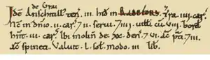 In his Latinised name of Anschtallus de Grai (an alternative spelling for Anschetillus) he is listed in the Domesday Book of 1086 as the lord of six Oxfordshire manors,[1] all held from William FitzOsbern, 1st Earl of Hereford[1] (c. 1020 – 1071), lord of the manor of Breteuil, in Normandy, a relative and close counsellor of William the Conqueror, whose chief residence was Carisbrooke Castle on the Isle of Wight, one of many English castles he built. The manors held by Anchetil de Greye were as follows: