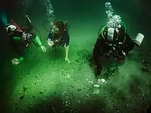 Shipwreck B also consisted of a large pile of amphorae but several types are visible, as are multiple timbers protruding from within the mound and on it. In addition to the Sinop-styles jars, several amphorae similar to examples excavated on the Yassiada Byzantine shipwreck and dating from the 5th to late 6th century AD are present.[5]