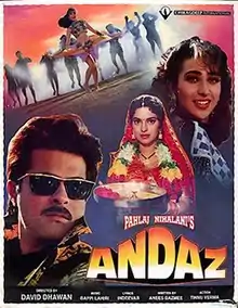 Andaz (transl.Style) is a 1994 Indian Hindi-language action comedy film directed by David Dhawan, starring Anil Kapoor, Juhi Chawla, Karishma Kapoor and Kader Khan. Other cast members include Raj Babbar, Shakti Kapoor, Satish Kaushik, Ishrat Ali, Mahesh Anand, Vikas Anand and Tej Sapru. It is a remake of Tamil film Sundara Kandam (1992), starring K. Bhagyaraj and Bhanupriya. The film was the 13th highest grossing Bollywood film of 1994.