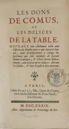 • At the time, it was considered best to "only cook with French cooks".[11] French chefs like Vincent La Chapelle were sought after by European princes.[12] Some of them, such as Frederick II, "to amuse themselves, do not disdain to speak sometimes about cooking",[13] as stated in the warning to Les Dons de Comus, a manual of "nouvelle cuisine" published in 1739 by François Marin.[14] Frederick II had also read Les Dons de Comus, even though French and German cuisine coexisted at his table.[15] He employed French chefs, such as the "famous Duval",[16] who entered his service in 1731.[17][note 2] In 1744, another French chef, Émile Joyard from Lyon,[18] son-in-law of Antoine Pesne,[19] joined Frederick's staff;[19] he remained maître d'hôtel for thirty years.[20][note 3]