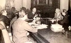 October 1955: President Eduardo Lonardi chairs talks with CGT leaders Luis Natalini and Andrés Framini (right).