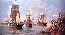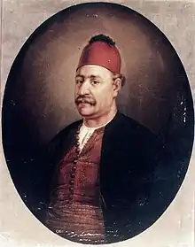 Miaoulis was born on the island of Hydra to an Arvanite[2] family of Euboean origin, namely from the town of Fylla.[3][4] He was known among his fellow islanders as a trader in corn who had gained wealth and made a popular use of his money. He had been a merchant captain, and was chosen to lead the naval forces of the islands when they rose against the government of the Sultan. Miaoulis contributed in every way possible to the cause of the resistance against the Turks. He expended the money he had made from his wheat-shipping business during the Napoleonic Wars.[5] Between May 1825 and January 1826,[1] Miaoulis led the Greeks to victory over the Turks in skirmishes off Modon, Cape Matapan, Suda, and Cape Papas.[1]