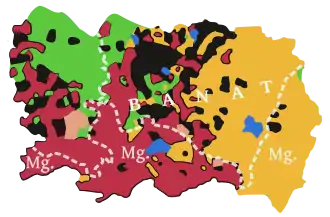 Ethnic map of the Serbian Voivodeship and Banat Military Frontier (Mg.), also marking the traditional borders of Banat. Serbs in red, Romanians in yellow, Hungarians in green. Danube and Banat Swabians in black, Czechs and Slovaks in blue, Banat Bulgarians in pink