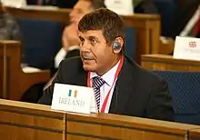 As chairperson of the Oireachtas Joint Committee on Agriculture, Food, and the Marine,[7] he also produced the first parliamentary report on the Offshore Oil and Gas sector in 2012, which called for a new fiscal licensing regime in Offshore Oil and Gas exploration off the coast of Ireland.[8] As part of the Irish Presidency of the Council of the European Union in 2013, he hosted a conference in Dublin Castle with EU member states Parliamentary Agriculture Committee Chairs from all 27 countries, engaging parliamentarians with speakers such as the European Commissioner for Agriculture, and then Romanian Prime Minister, Dacian Ciolos and the European Commissioner for Fisheries, Maria Damanaki.[9]
