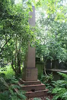 His monument, a tall obelisk of polished red granite, can be seen today at the London Congregationalists' garden cemetery, Abney Park Cemetery close to that of his son, Charles Reed, the eminent lay Congregationalist, typefounder, and Chairman of the first London School Board.