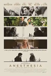 Anesthesia is a 2015 indie drama film written, produced and directed by Tim Blake Nelson. Nelson stars in the film with Sam Waterston, Kristen Stewart, Glenn Close, Gretchen Mol, and Corey Stoll. The film premiered at the Tribeca Film Festival on April 22, 2015.[2] The film was released in a limited release and through video on demand by IFC Films on January 8, 2016.[3]