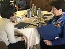 In 2018, Aribam was selected for the inaugural cohort of the prestigious VVEngage Fellowship.[1] VVEngage Fellowship is a Vital Voices programme that focuses on advancing women's public leadership. VVEngage Fellows participate in a rigorous online and in-person training, connecting with a global network of peers and mentors.[41][42][43] During the programme, she received mentorship from former Prime Ministers Beatriz Merino of Peru, Jenny Shipley of New Zealand, and Kim Campbell of Canada.[44][43][45] Professors of Harvard Kennedy School, amongst others, trained Aribam during the fellowship.