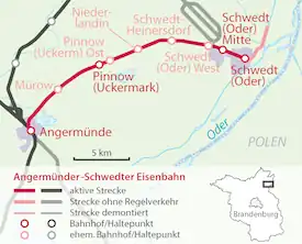 The Angermünde–Schwedt railway is a single track branch line in the district of Uckermark of the German state of Brandenburg. It connects the towns of Angermünde and Schwedt and the municipality of Pinnow to each other. Several halts on the line were abandoned in the 1990s.