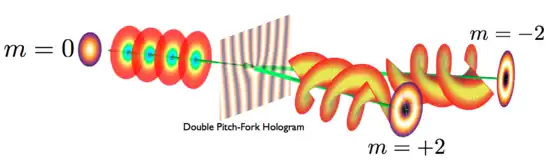 A more convenient approach for generating OAM is based on using diffraction on a fork-like or pitchfork hologram (see figure).[7][8][9][10] Holograms can be also generated dynamically under the control of a computer by using a spatial light modulator.[11]