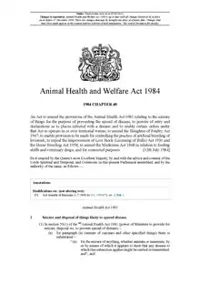 The Animal Health and Welfare Act 1984 (c. 40) was a piece of UK legislation that amended the provisions of the Animal Health Act 1981 related to