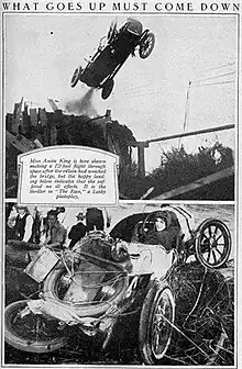 In 1915, King decided to put her automobile driving experience to the test and set out to become the first female to drive alone across the continental United States. With the backing of studio boss Jesse L. Lasky, and his newly formed Paramount Pictures, they got the Kissel Motor Car Company to provide her with a vehicle equipped with Firestone tires. Dubbed "The Paramount Girl," amidst much publicity on August 25, she set out in her Kissel Kar from Paramount's studio in Hollywood. The Los Angeles Times wrote, "Her only companions will be a rifle and a six shooter."[1] Lasky arranged for Geraldine Farrar to bid farewell to King at the start of the trip.[1] First heading north to San Francisco, King spent several days doing publicity appearances at the Panama-Pacific World's Fair. With even more fanfare, and declaring that "if men can do it, so can a woman," she headed east. After many promotional stops at Paramount theaters along the way, and coverage by major newspapers coast to coast, on 19 October, after forty-nine days on the road, King received a hero's welcome in New York City, with Motor Age remarking she had arrived with "Los Angeles air in the front tires of her car".[1]