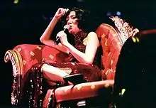 In terms of live performances, in 1985, at the age of 21, her first concert was held lasting 15 nights (thus being one of the youngest singers to hold a concert at the Hong Kong Coliseum). Beginning in late 1987, a series of 28 consecutive concerts at the Coliseum was held through early 1988. This established a record at the time and dubbed Mui the title of "Ever Changing Anita Mui" (百變梅艷芳), which had become her trademark.[21] Her popularity was also gaining prominence outside of Hong Kong, as she was invited to sing at the 1988 Summer Olympics opening ceremony in Seoul together with Janet Jackson as well as also performing her own solo with one of her hit songs of that year, "Blazing Red Lips (烈燄紅唇)".[22][23][24] She performed in 300 concerts in her career.[4][9] In 1995, Mui performed the song "Bad Girl" (a Cantonese cover of Sheena Easton's "Strut") in Guangzhou, China, where it was banned,[7][25] as it was considered pornographic in nature.[7] The government authorities in Guangzhou were infuriated when she chose to sing the song on the last day of her concert.[25]