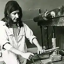 ![]() Wetzel operating the hydraulic press at the Women's Studio Workshop (WSW) in 1979 | |