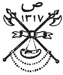 Coat of arms of the Anjoman-e Okhovat. Shahrokh Raei notes: "The coat of arms consists of two dervish axes (tabarzīn), which intersect and form a multiplication sign, a begging bowl (kashkūl) and a rosary (tasbīḥ)". The letter ṣād at the top refers to the founder of the order Safa'alishah (i.e., Ali Khan-e Qajar, also known as Zahir-ol-Dowleh). The year 1317 (1899) written between the two axes refers to the foundation year of the Anjoman-e Okhovat.