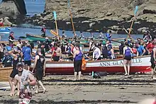 Ann formed a crew of four female rowers who took part in local regattas; she was noted for her large stature and for her crew who dressed in white caps and dresses. Their success led to competitions all over the country; one event at Fleetwood was watched by Queen Victoria, who congratulated Ann when they won by beating an all-male crew. The most famous competition was said to have been in 1833 when they visited Le Havre and beat the best ten French male crews by 100 yards; this led the press to call her the champion female rower of the world.[1][2][3] However, recent research by A T Goodman for the Old Cornwall Society has thrown doubt on this version of events. The visit to Le Havre was actually in August 1842 aboard the paddle steamer Grand Turk; the French refused to put up a team to row against women and so a demonstration race was conducted between Ann Glanville's female crew and male rowers from the Grand Turk, which was won by the women.[2]