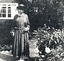 Anna Åbergsson was introduced to allotment gardening through her friend, the social democratic politician and social reformer Anna Lindhagen. Lindhagen had first encountered allotment gardens in Copenhagen in 1903 and was immediately taken by the health-related benefits that the small garden compounds offered urban working-class families who at the time often suffered from squalor living conditions, a lack of fresh air and poor nutrition. In 1906 Åbergsson and Lindhagen initiated the establishment of Sweden's first association for allotment gardens, Föreningen koloniträdgårdar in Stockholm (today Föreningen Stor-Stockholms Koloniträdgårdar, FSSK); Lindhagen becoming director and Åbergsson financial accountant. When Stockholm municipality in 1921 took over the management of the garden colony, Åbergsson took over the position of director from her friend.[8] By 1918 she had also become the accountant for Frisinnade landsföreningen (National Association of the Liberal-Minded), was secretary of Folkhushållningskommissionens koloniavdelning (the Department for Allotment Gardening of the Public Housekeeping Commission) and together with a group of fellow allotment gardeners had founded Odlingssällskapet Stockholms Omnejd (Cultivation Society Stockholm’s Region) with the gardening colony Bergshamra, for which she continued to work until her death in 1937.[9]