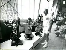 Anne Currie (third from left) winning bronze in the A1 100m freestyle medal ceremony at the 1984 New York Summer Paralympic Games.