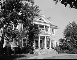 The two-story, stone mansion is seven bays by four bays, with a hipped roof. The central door is flanked by narrow windows and has a two-level pedimented porch supported by Roman Ionic columns. Later a 1+1⁄2-story, stuccoed frame rear ell was added. It features a considerable carved interior woodwork, including modillioned cornice and balustraded deck, as well as four interior end chimneys. Also on the property is a contributing kitchen building.[11]