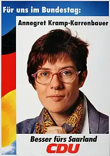 Annegret Kramp-Karrenbauer joined the CDU while still in high school in 1981. In 1984 she was elected to the district council of Püttlingen, and in 1985 became chairwoman of the city's CDU association. From 1985 to 1988 she was also a member of the regional board of the Young Union in Saarland. From 1991 to 1998 she served as a policy and planning officer for the CDU in Saarland under environment minister Klaus Töpfer. In 1998, Kramp-Karrenbauer replaced Töpfer in the federal Bundestag, serving seven months before losing re-election in the SPD landslide the same year.[8] In 1999, she was an advisor to Peter Müller, then chairman of the CDU parliamentary group in the Landtag of Saarland and later Minister-President. That same year she became a chairwoman of the Women's Union.