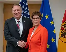 Annegret Kramp-Karrenbauer (German pronunciation: [ˈanəɡʁeːt ˈkʁamp ˈkaʁənˌbaʊɐ]; née Kramp; born 9 August 1962), sometimes referred to by her initials of AKK,[1] is a retired German politician who served as Minister of Defence from 2019 to 2021 and as Leader of the Christian Democratic Union (CDU) from 2018 to 2021.